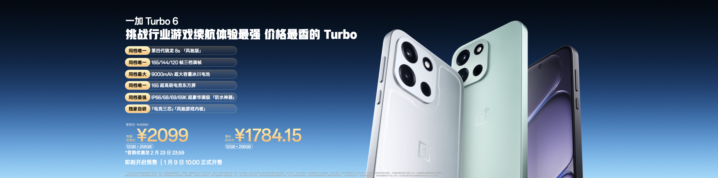 一加 Turbo 6 将于1月9日10:00全渠道正式开售,首销优惠价2099元起,国补到手价1784.15元起;一加 Turbo 6V 将于1月9日10:00全渠道正式开售,首销优惠价1699元起,国补到手价1444.15元起。